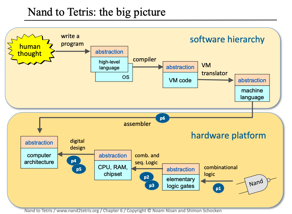 A course which builds a modern software hierarchy starting from simulated bare-bones computer hardware and ending at the implementation of a high-level, object-oriented langauge.